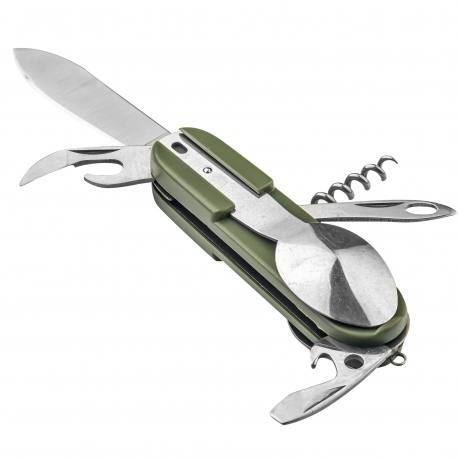 Отличный аксессуар для походов, пикников, выживания, охоты или рыбалки, сочетающий в себе 7 предметов - нож, ложку, вилку, шило для плетения и штопания рыболовных сетей, штопор, открывашки для бутылок и консерв. Недорогой компактный нож заменит громоздкий и дорогой набор!