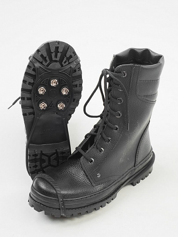Противоскользящие накладки на обувь снабжены пятью стальными шипами и петлями: маленькая петля крепится на мыс ботинка, большая на заднюю сторону – на пятку.
