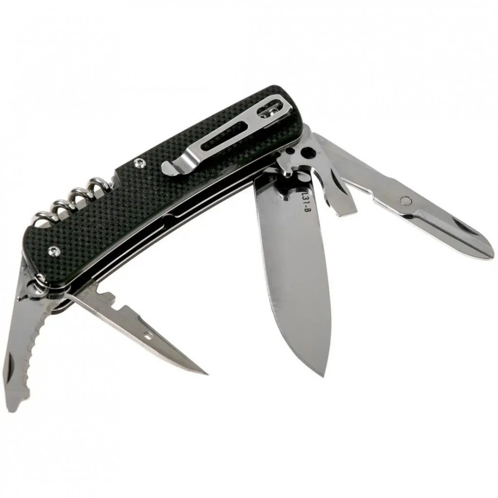 Помимо режущего клинка, с той же стороны рукоятки можно достать миниатюрные ножницы или инструмент, совмещающий в себе сразу несколько функций. Это открывалка для бутылок, прямая отвертка шириною 6,5 мм, два инструмента для зачистки от изоляции любых проводов. С противоположной стороны рукоятки достается шило-развертка с отверстием для нитки, которое сделано заточенным с одной стороны. Этот же инструмент может использоваться как маленький гаечный ключ. Отдельно сделан инструмент для перерезания строп, на конце которого имеется узкая (3 мм) прямая отвертка. Непосредственно в торец рукоятки встроен стеклобой и небольшое стальное кольцо для темляка. Здесь же размещены щипцы, которые можно полностью достать из рукоятки и использовать как совершенно самостоятельный инструмент. А на спинке рукоятки имеется штопор.