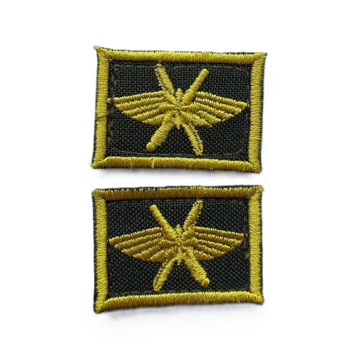 Нашивка петличная ВВС вышитая на оливковом фоне желтыми нитками пушка, крылья, пропеллер. На липучках.