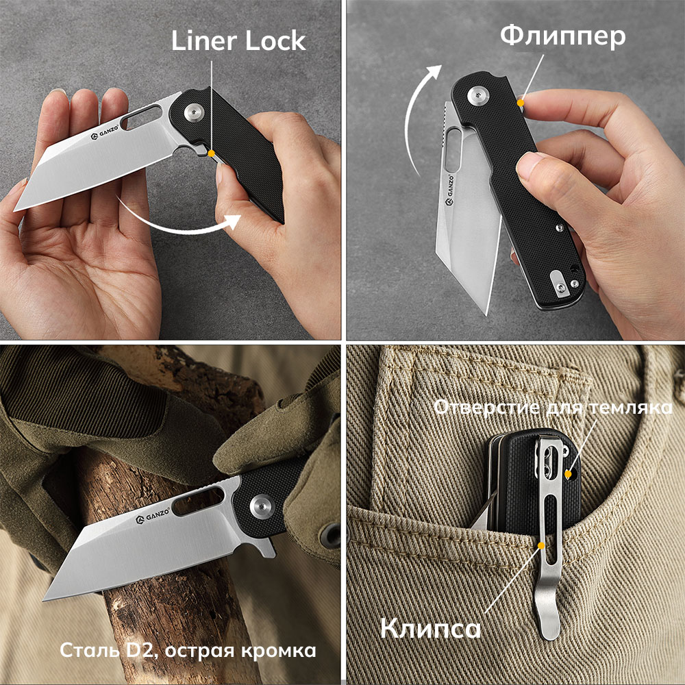 Ganzo G770-GR — это складной нож с клинком из стали D2 и рукояткой из G10. Оснащен замком Liner Lock, обладает общей длиной 204 мм и весом 130 г. Подходит для повседневного ношения, туризма, охоты и тактических задач, обеспечивая надежность и удобство в использовании.