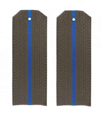 Погоны оливковые с одним голубым просветом на пластиковой основе. Длина 14 см.
