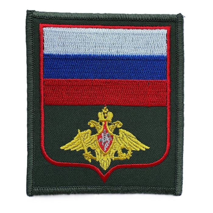 Шеврон вышитый Министерство обороны на зеленом фоне, ткань габардин. На липучке. Размер: ширина 8,5см; высота 10см.