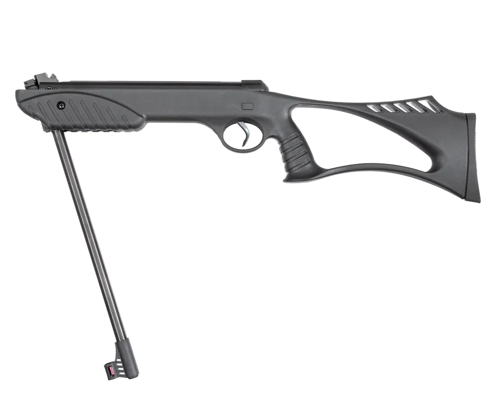 Представленная пневматическая винтовка использует традиционный и привычный для многих владельцев пневматики пружинно-поршневой механизм, который нагнетает требуемое для выстрела давление за счет сжатия воздуха в цилиндрическом ресивере. Взводится описанный узел посредством переломной схемы, при которой витая пружина сжимается путем «складывания» ствола.